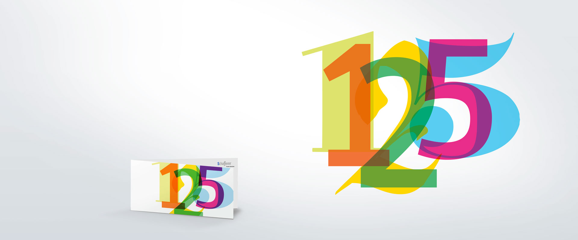 Dieses Gesicht fügt sich nahtlos in den Auftritt der Einzelhandels-Marke Schafferer ein. Produktvielfalt gehört zu dessen Merkmalen. Zum Jubiläum wird daraus ein „bunter“ Blumenstrauß gebunden. Das macht die Marke lebendig und die Produkte sympathisch. Ein solches Key Visual wird ergänzt durch das Jubiläums-Zeichen: Viele Schriftarten, viele Farben angewandt auf nur drei Ziffern: So wird die Vielfalt der Marke Schafferer vermittelt. – Ein heiteres und unverwechselbares Zeichen für die Kommunikation zum Jubiläum.