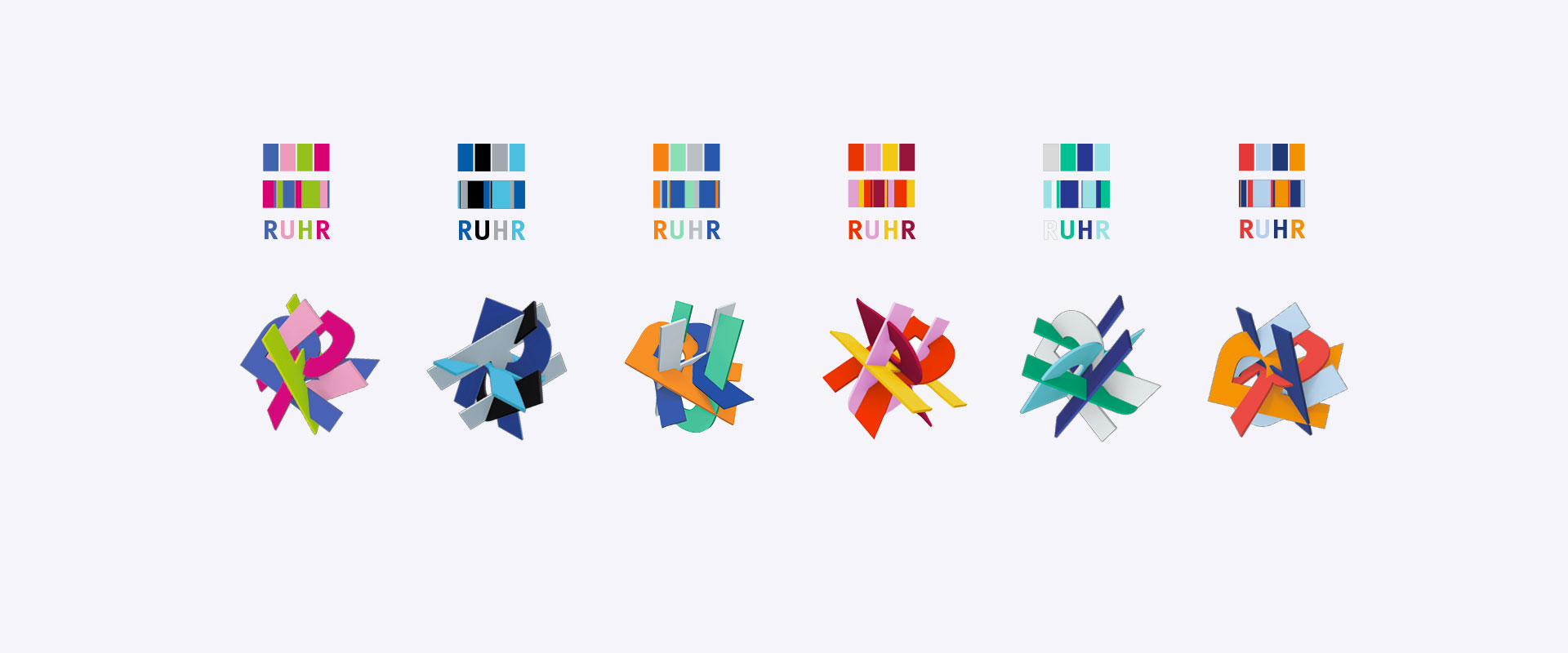 Das Ruhr-Genom lebt von seiner Vielfalt. Subjektiv ergibt jeder Blickwinkel ein eigenes Bild. Aber auch objektiv erscheinen die Einzelteile in unterschiedlichen Zusammensetzungen und in unterschiedlichen Farbstellungen. Doch es gibt einen gemeinsamen – identitätsstiftenden – Nenner: Die formale Erscheinung wird durch den kompakten Kern und die dynamisch auseinanderstrebende Peripherie bestimmt, ebenso durch das immer gleiche Inventar der Einzelelemente. Das Ruhr-Genom besitzt eine übergreifende, ortsunabhängige Zeichen-Identität und ebenso eine individuelle, an den jeweiligen Ort gebundene, Kombinations- und Farb-Identität.