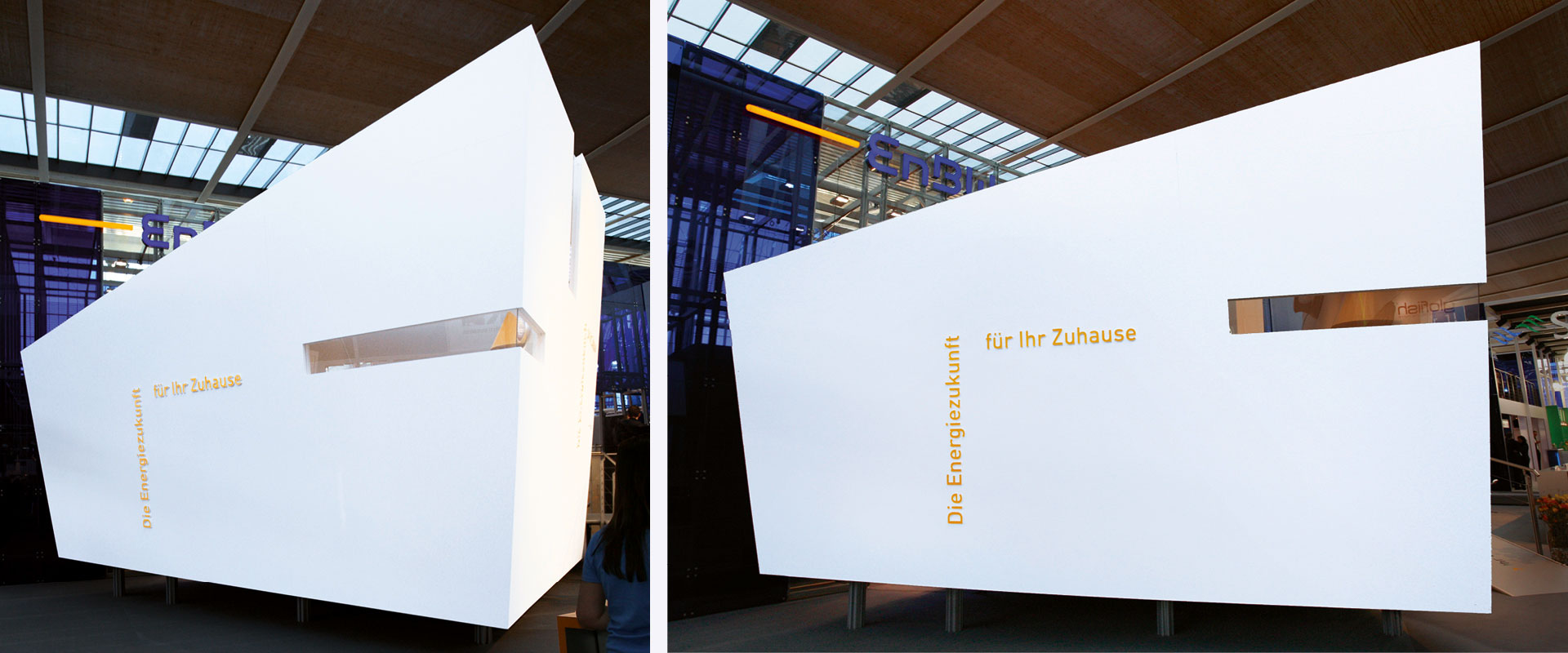 Das weiße Smart Home durchbricht die Normen rechtwinkliger Wahrnehmung und zugleich die Normen herkömmlicher Architektur. Damit wird nicht nur Auffälligkeit erreicht, sondern zugleich das Innovative, Ungewöhnliche und Unkonventionelle des Inhalts umgesetzt. Denn hier erwarten den Besucher Informationen, die den Rahmen des Normalen und Erwarteten sprengen.