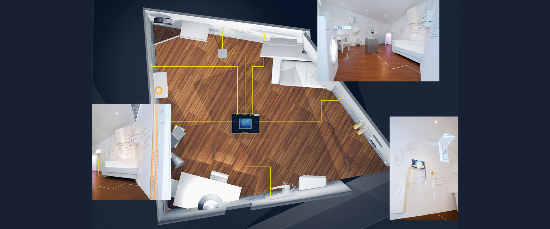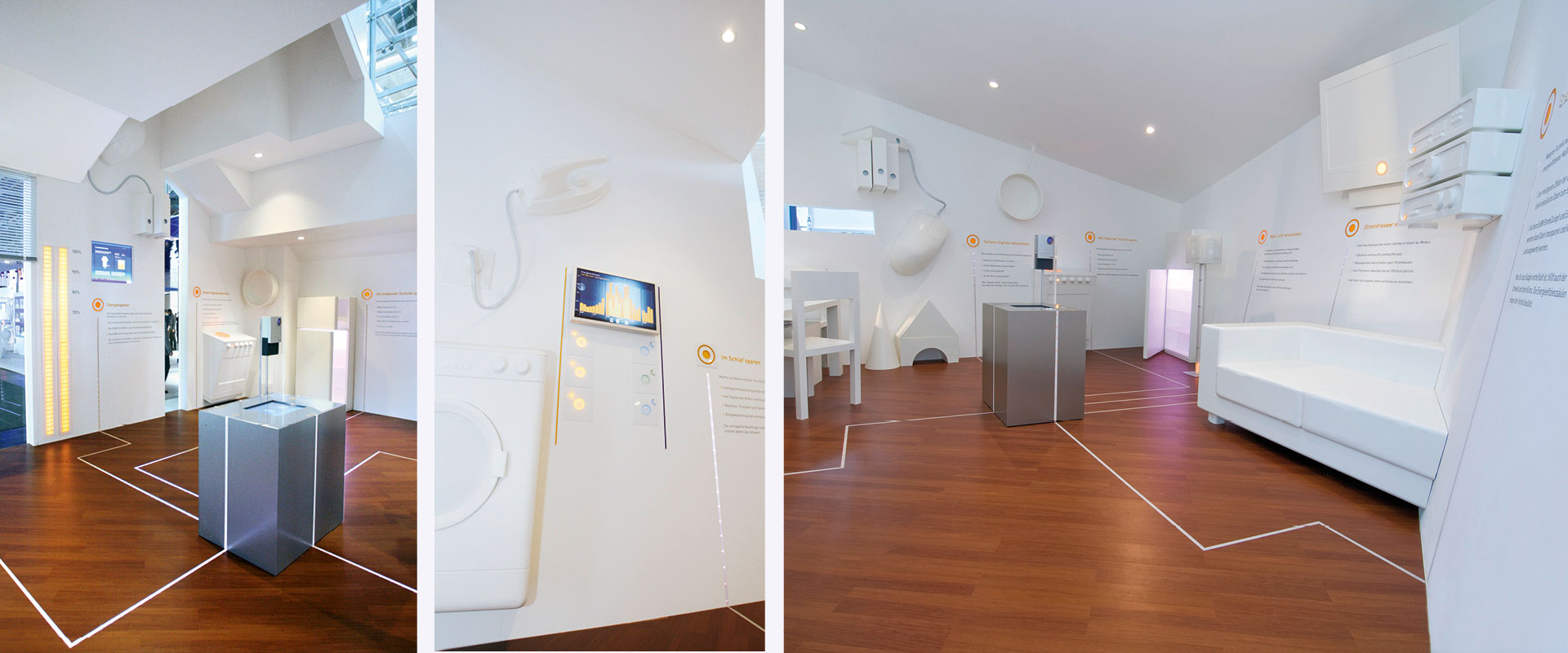 Ein Terminal im Zentrum liefert ausführliche Informationen zu den verschiedenen Exponaten, die ringsum an den Wänden angeordnet sind. So werden Stand-by-Schaltungen oder veraltete und schadhafte Geräte als unnötige Stromfresser entlarvt. Das Einsparpotenzial durch die Nutzung von preiswertem Nachtstrom wird demonstriert und mit unterschiedlichen Zielgrößen verglichen. Dabei wird nicht nur eine ökonomische, sondern ebenso eine ökologische Bilanz gezogen. Das Fazit für den Besucher wird Schritt für Schritt durch erläuternde Texte gezogen. Die weißen Wände werden dabei zu ästhetischen Informationsträgern.