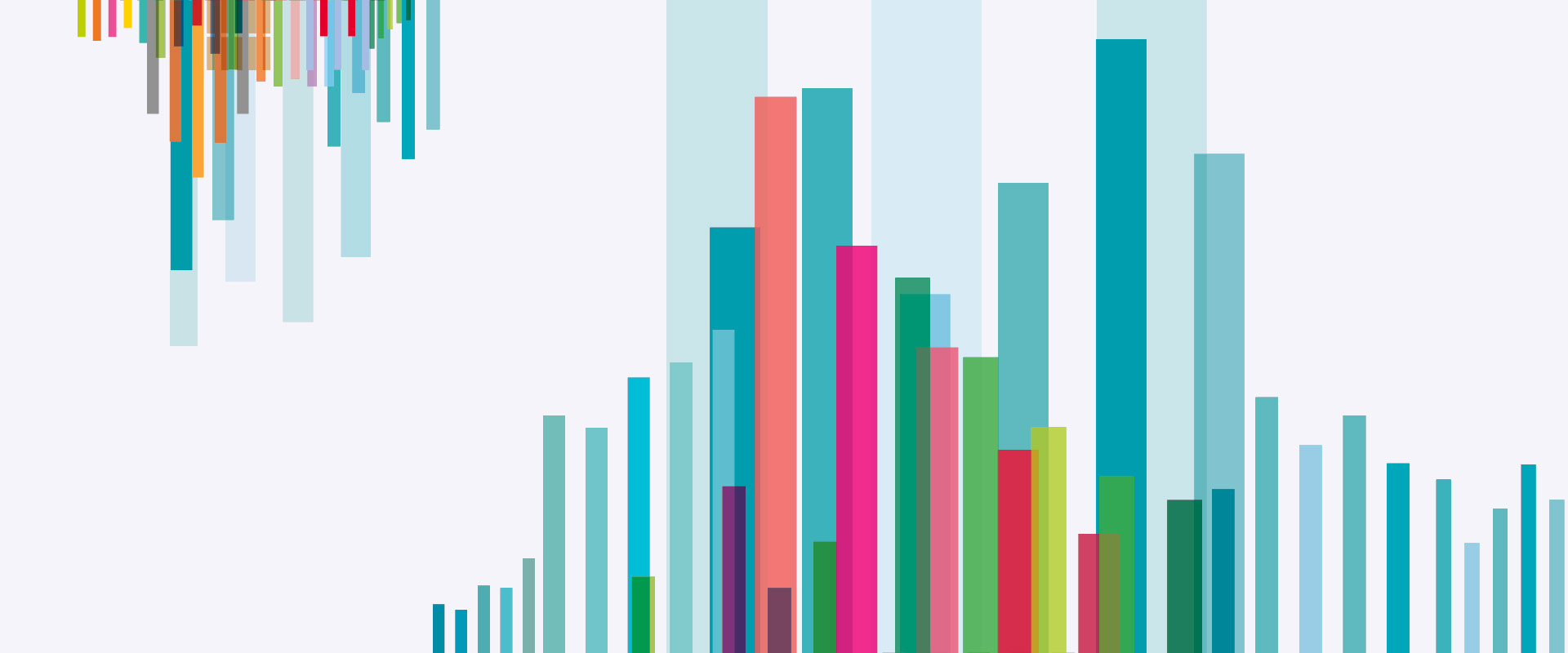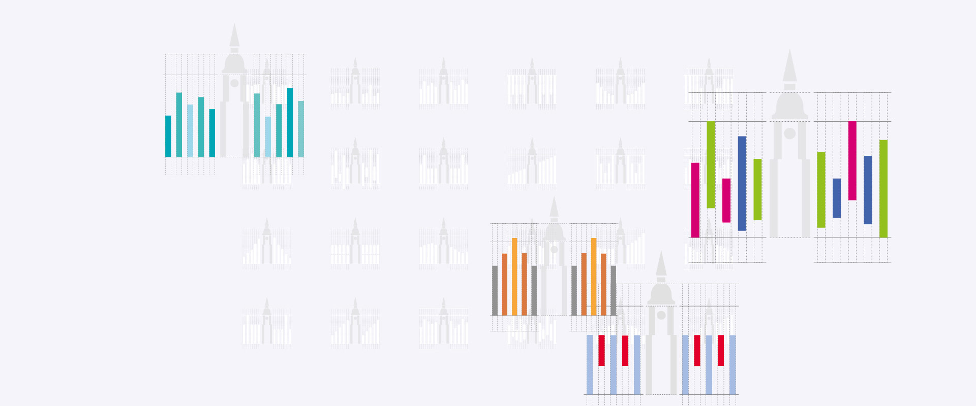 Das generative Design-Konzept von identis schafft ein Zeichenrepertoire aus einem einzigen Grundelement. Die Balkenform wiederholt sich in regelmäßigen Abständen und variiert nur in der Höhe und in der Farbe. Damit erhalten alle städtischen Institutionen einen eigenen visuellen Auftritt, ohne dass die Einheit des Ganzen verloren geht.