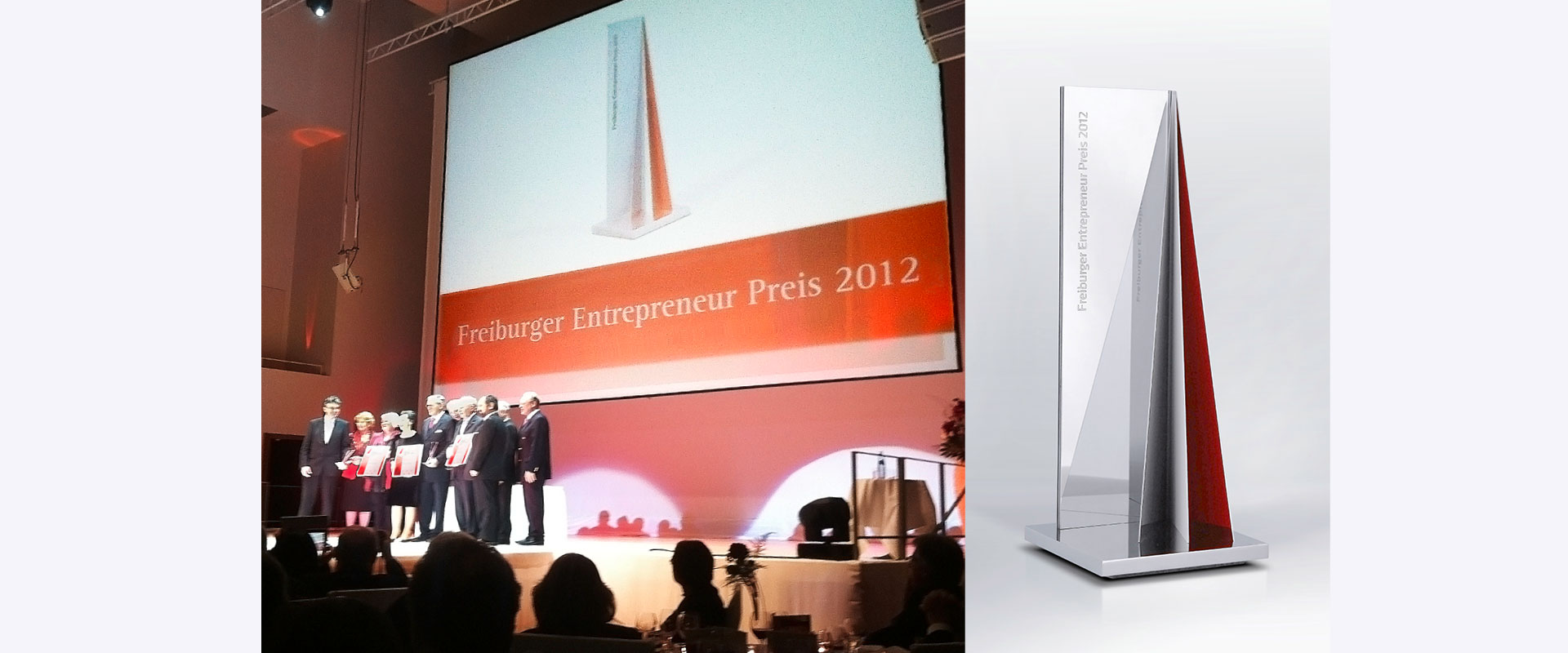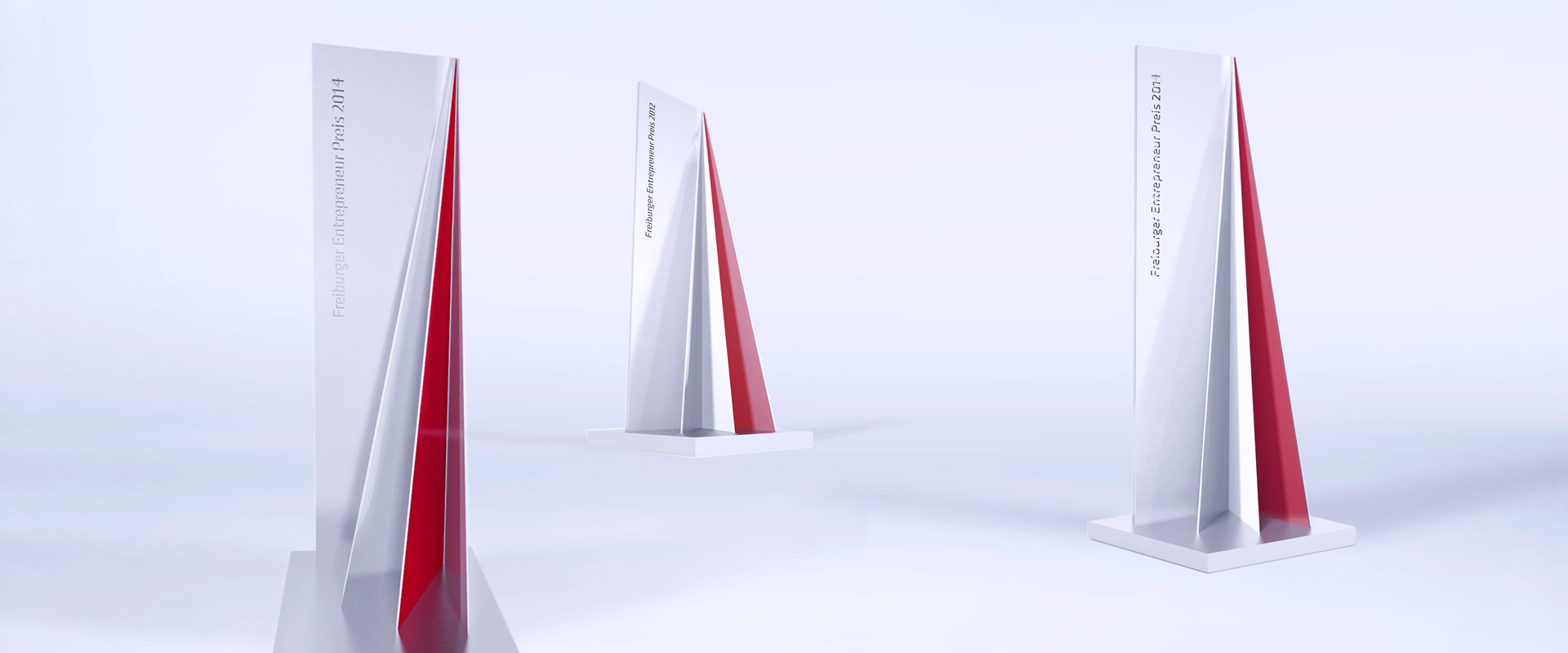 Die Freiburger Wirtschaft Touristik Messe GmbH verleiht im Rhythmus von zwei Jahren den Freiburger Entrepreneur Preis für herausragende und Beispiel gebende Leistungen in den drei Sparten Wirtschaft, Touristik und Messewesen. Dafür gestaltete identis eine Skulptur, die das zukunftsweisende innovative Moment des Preises ausdrückt und der Auffächerung in drei Bereiche in Form des stilisierten Münsterturms ein Bild gibt.