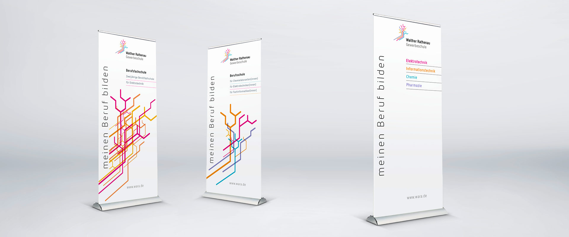 Zu den Besonderheiten der Walther-Rathenau-Gewerbeschule gehören eine ethische Orientierung – begründet durch den Namensgeber –, eine pragmatische pädagogische Haltung und die hohe Qualität des Angebots. 80 Lehrende unterrichten 1200 Lernende in den Fachrichtungen Elektrotechnik, Informationstechnologie, Chemie und Pharmazie. „Die Erfolgsplattform“ ist die von identis formulierte kommunikative Leitidee. Erfolg steht für den Sinn der Schule, für die Erfüllung der Wünsche, die junge Menschen bezogen auf ihre berufliche und vor allem ihre persönliche Entwicklung und Entfaltung haben.