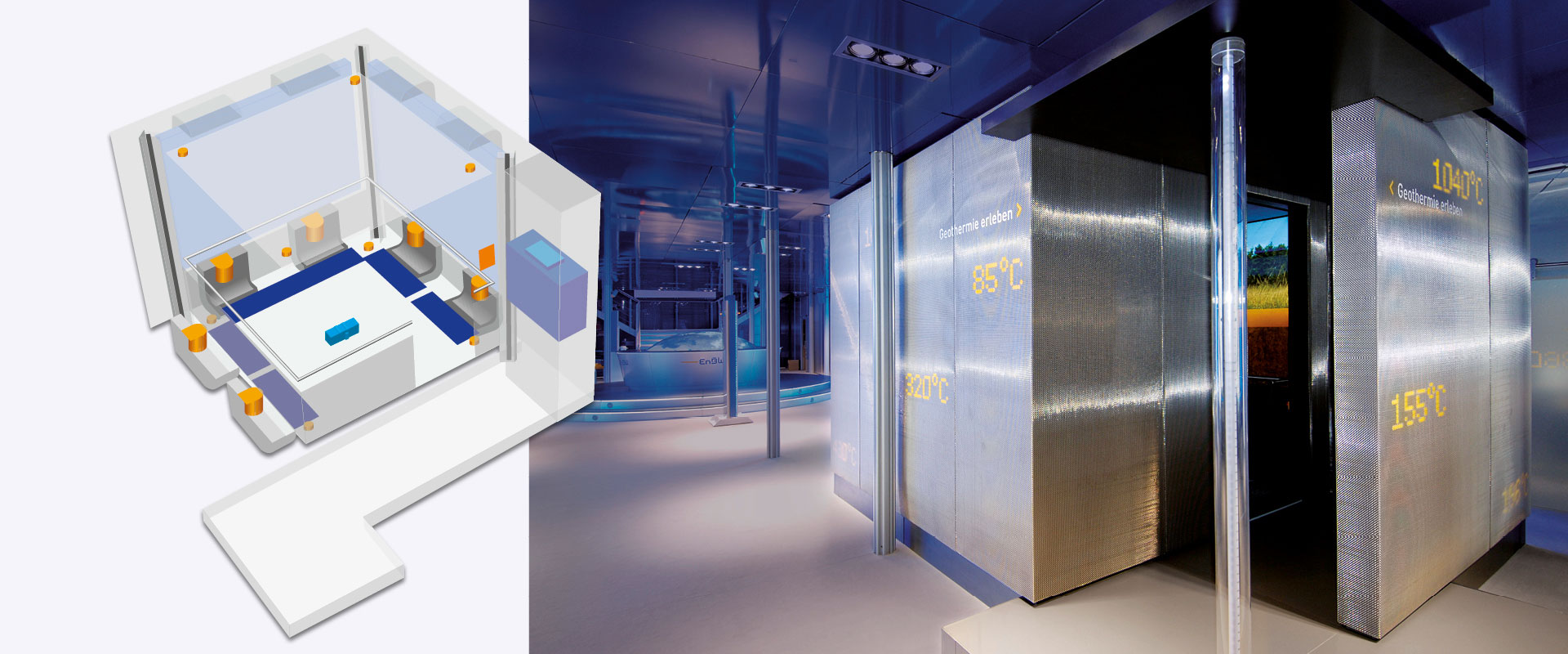 Das Thema Geothermie – Energie aus Erdwärme – wird erlebbar gemacht durch eine simulierte Fahrt ins Erdinnere. Dafür wurde der „Geothermie Cube“ entwickelt, den die Besucher wie einen Aufzug betreten können, um in die Tiefe zu fahren. Die Fahrgäste finden Platz in einem Raum von 3 x 3 m Grundfläche und 2,25 m Höhe.