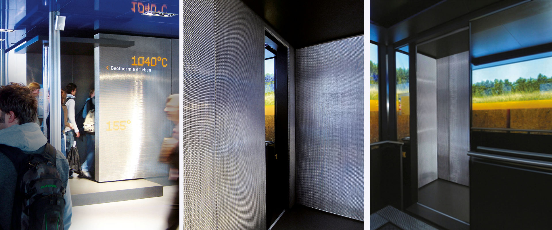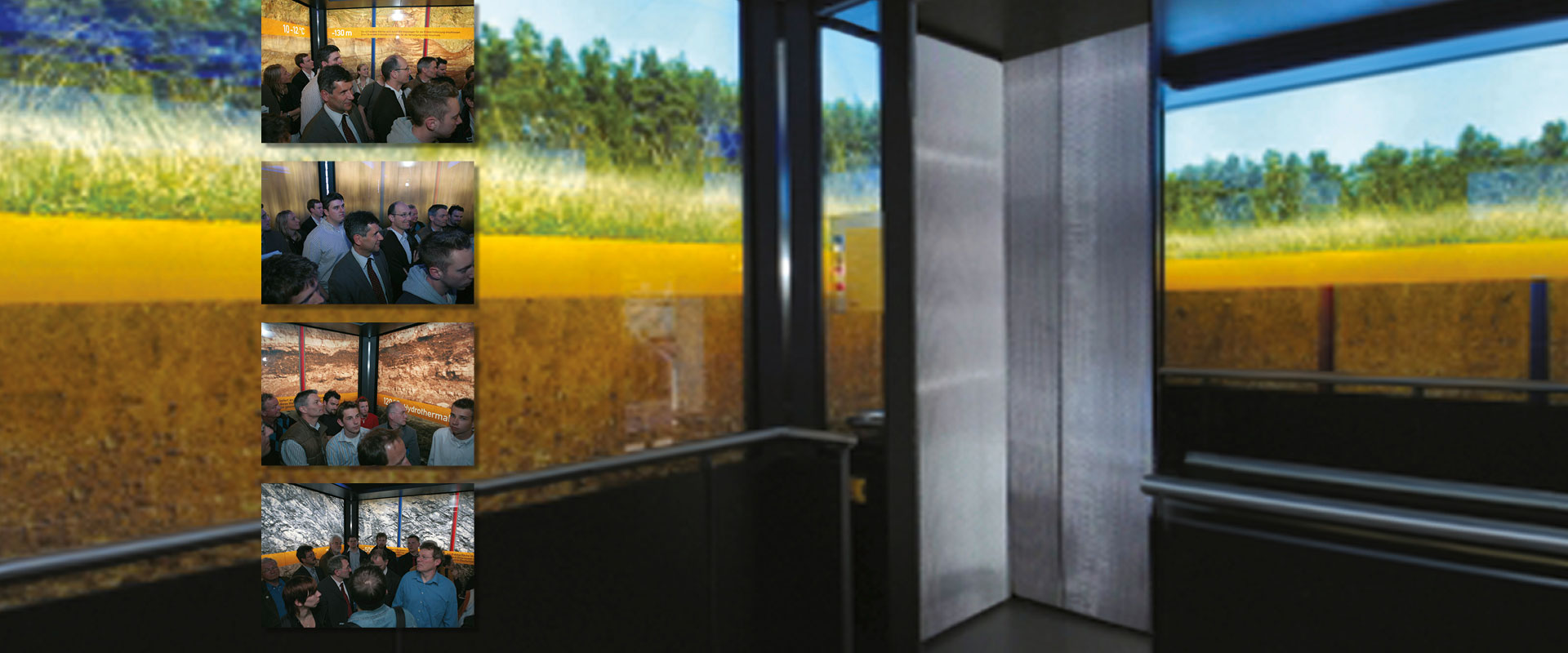 Die Fahrt in das Erdinnere wird simuliert durch Vibrationen, Fahrgeräusche, Lichteffekte und visuelle Eindrücke. An den Wänden erfolgt über Scroller ein schneller Bildlauf, der die Materialität des Erdinneren abbildet. In den simulierten Erdtiefen von 130, 2500 und 5000 Metern kommt der Aufzug zum Stehen. Hier wird durch Texteinblendungen und akustische Sprache über das jeweilige Energiepotenzial und seine Nutzung informiert.