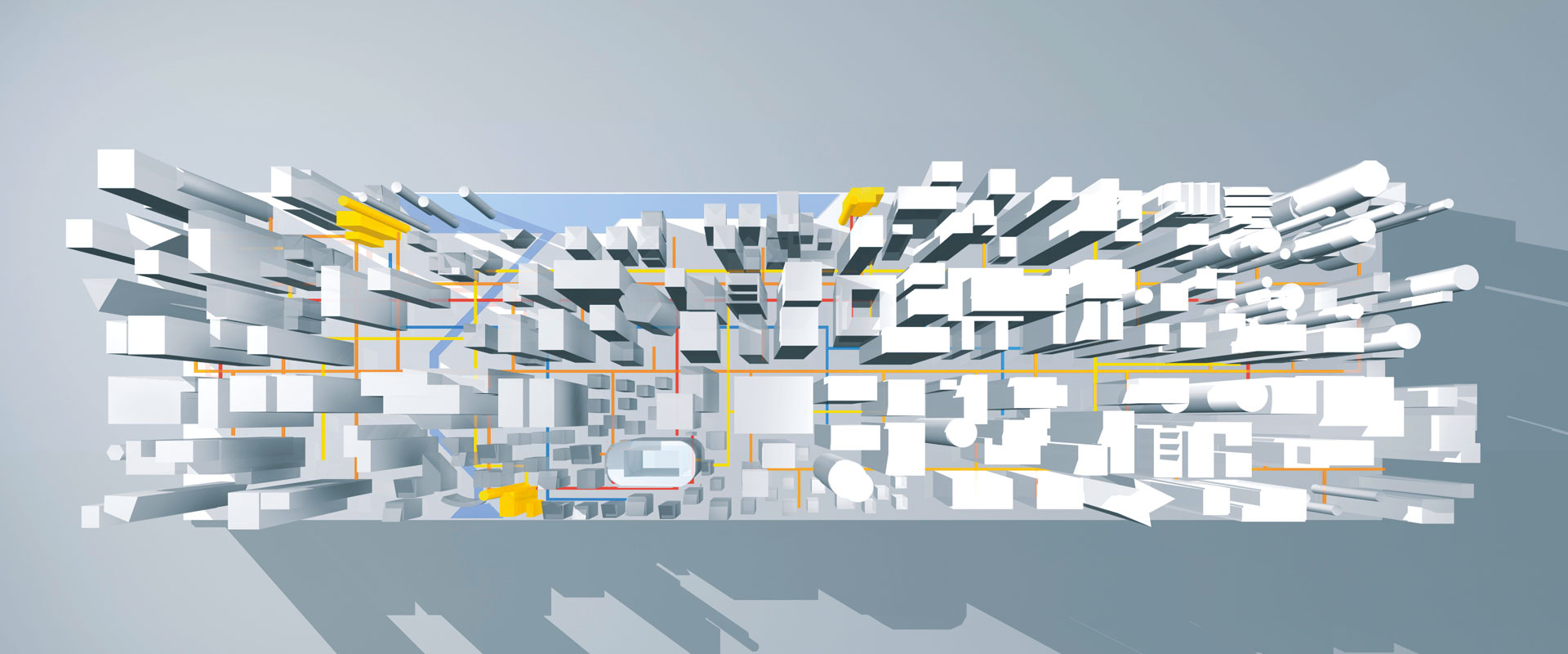 Durch die vertikale Anbringung nimmt das Modell bei riesenhafter Ausdehnung kaum Platz in Anspruch. Die Einzelelemente des Modells sind nicht rechtwinklig kubisch angelegt, sondern zentralperspektivisch verzerrt gebaut. Dieses Modell kann interaktiv befragt werden. Der Messebesucher kann von einem Terminal aus mehrere Parameter beeinflussen: Konventionelle contra erneuerbare Energie-Erzeugung, zentrale contra dezentrale Energie-Versorgung und niedriger contra hoher Gebäude-Standard. So können die Faktoren Wirtschaftlichkeit, Emission und Kapazität unterschiedlich verteilt werden. Es lassen sich drei Idealszenarien darstellen.