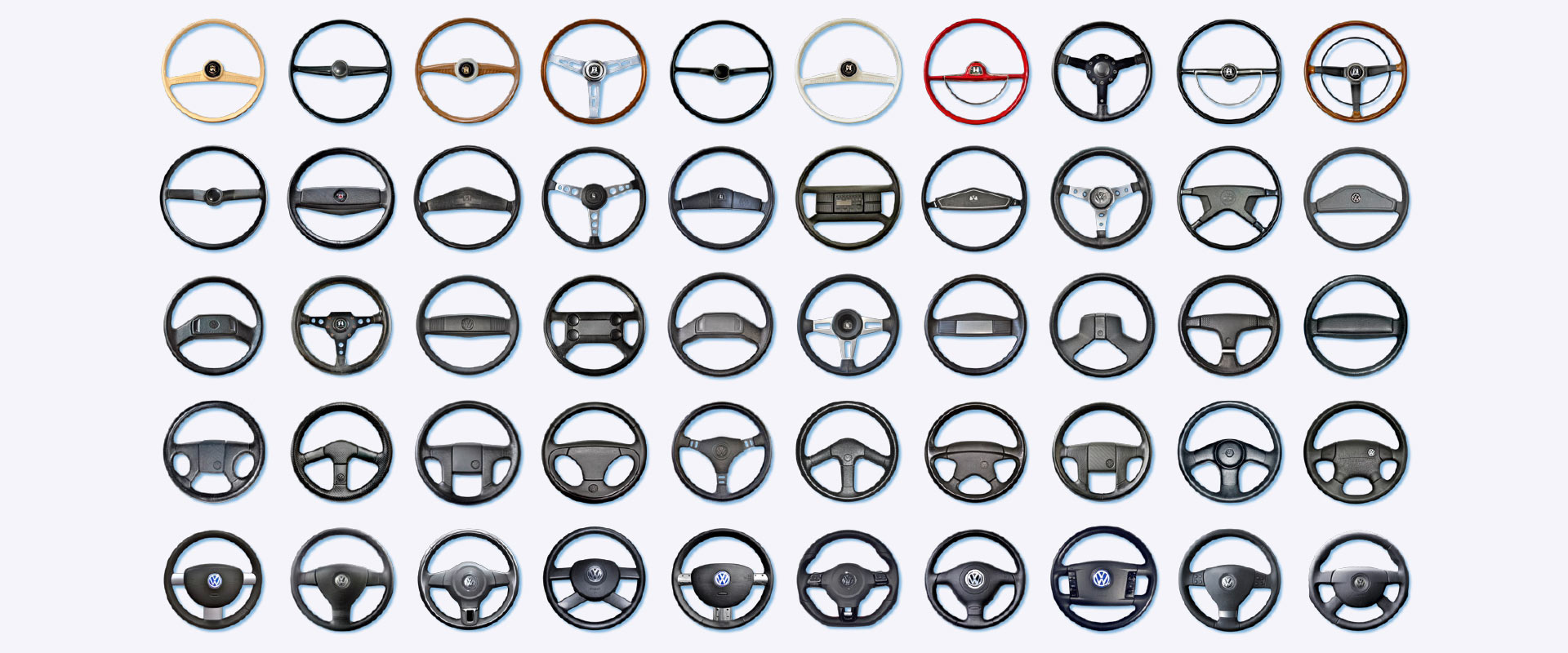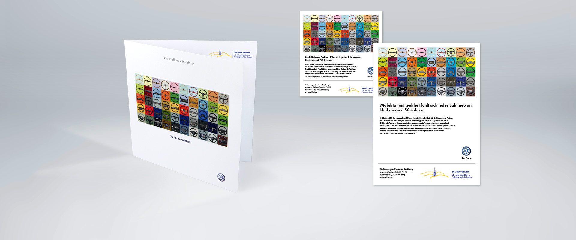 Autohaus Gehlert in Freiburg, einer der größten VW-Händler Deutschlands, wird 50. Das ist Anlass für eine große Kommunikations-Offensive. Und für identis eine umfassende Designaufgabe. Die Botschaft: 50 Jahre Mobilität für eine ganze Region. Das Key Visual bildet 5 Jahrzehnte ab: Ein aktuelles VW-Lenkrad steht jeweils für ein Jahr. So entsteht ein Ordnungsgefüge voller Lebendigkeit. Die Basis-Idee der 5 mal 10 Lenkräder macht 50 „Jahresringe“ sichtbar.