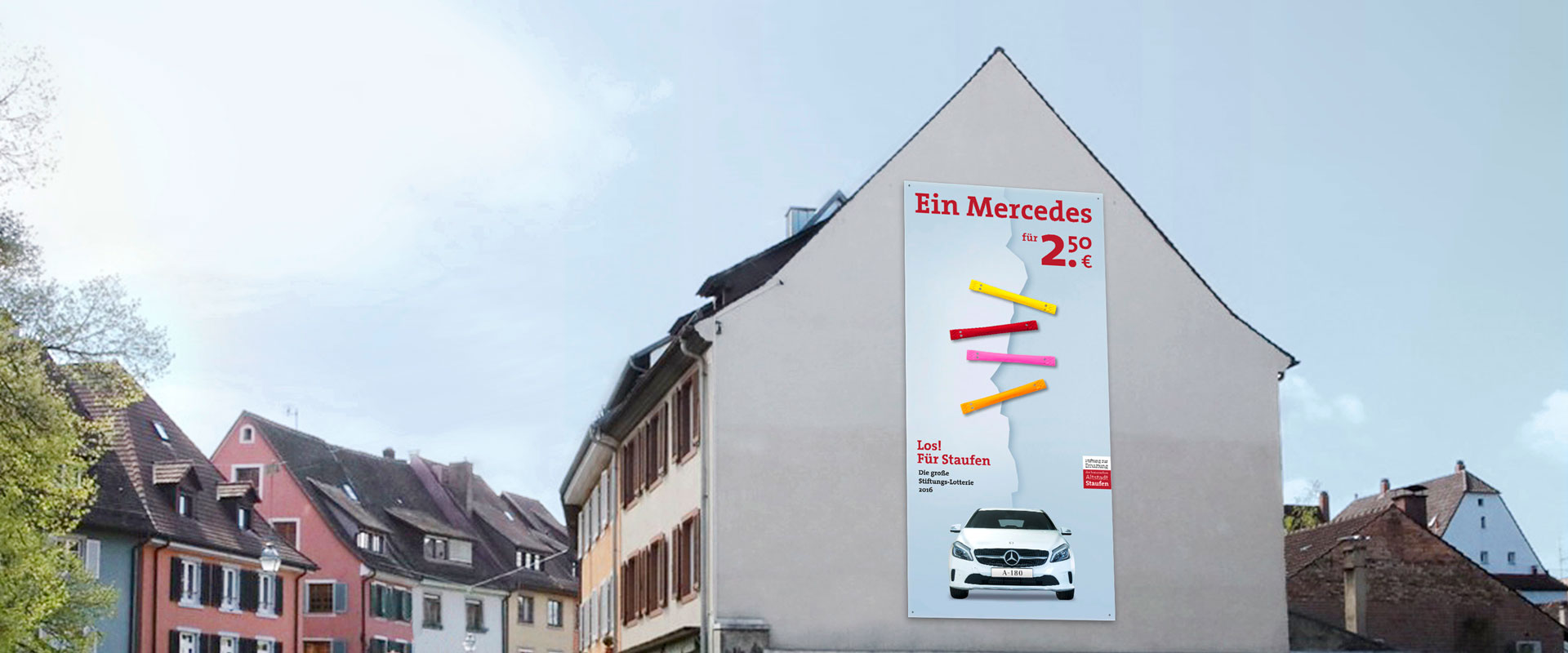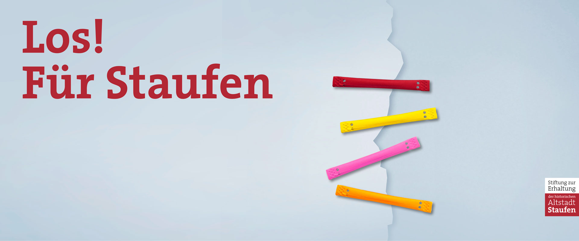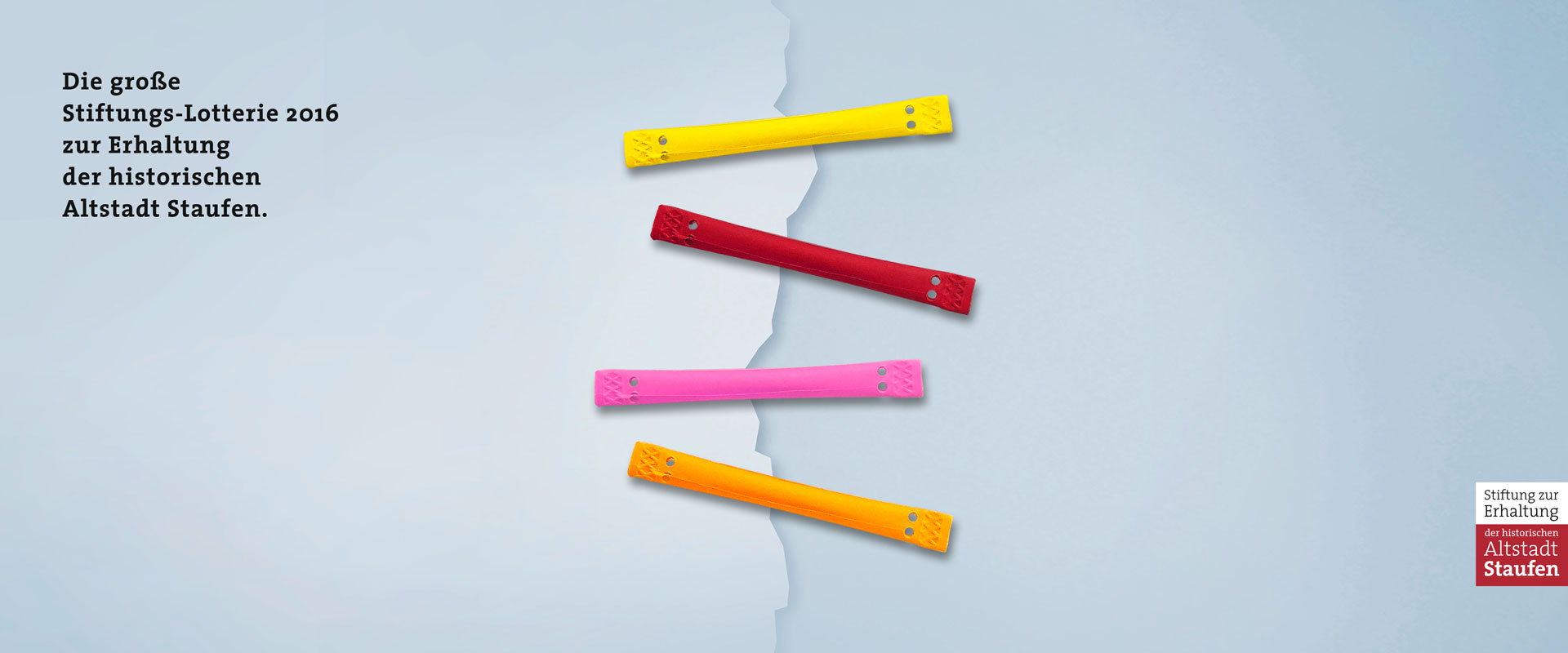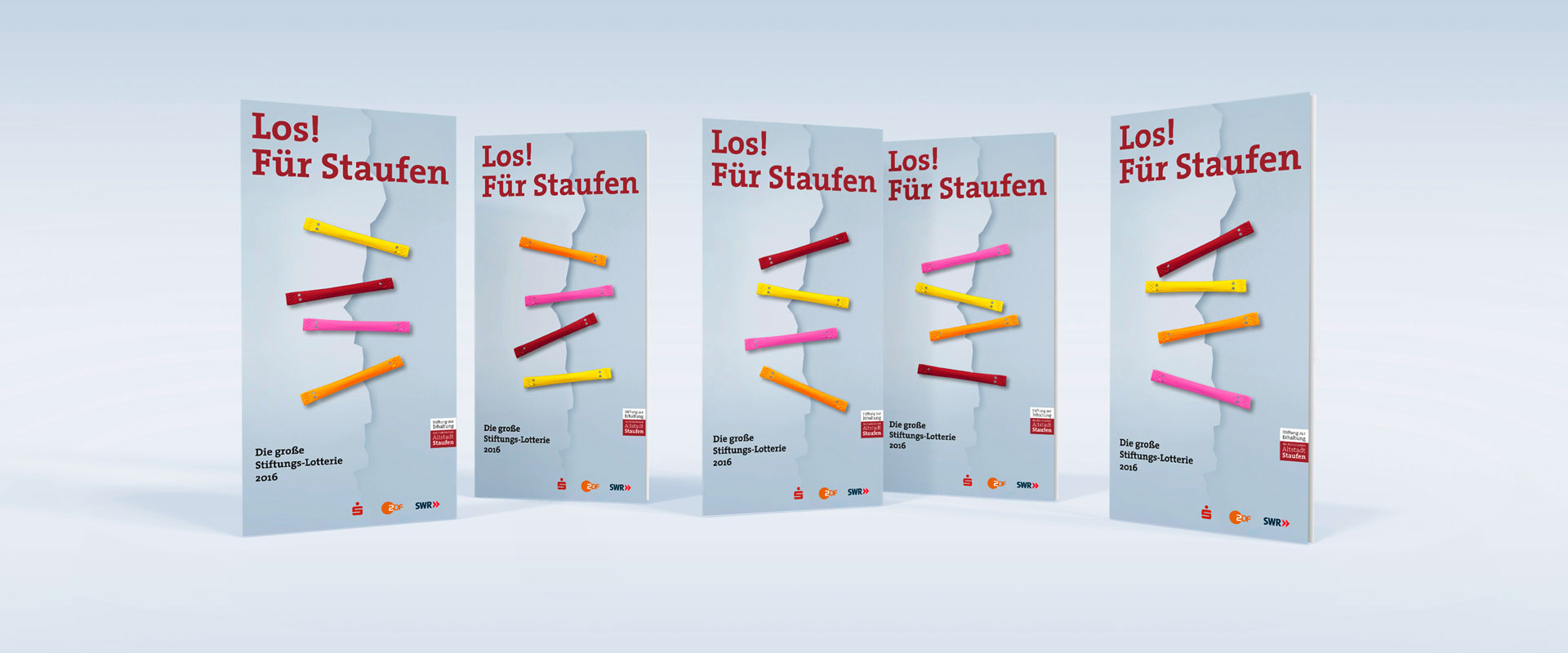 Angeregt wird diese Bereitschaft zusätzlich durch die von identis entwickelte Kommunikation zur Lotterie. Die Teilnahme soll Spaß machen. Mit der Aufforderung „Los! Für Staufen“ wird ein Bild penetriert, das Lose in freundlichen Farben als Problemlöser zeigt. Wie die Stiche einer Naht halten die greifbar plastischen Lose einen imaginären Riss zusammen. Das Thema der Rissbildung ist die Konstante der seit Jahren sehr erfolgreichen Kommunikation der Staufen-Stiftung. Daran knüpft die Lotterie sichtbar an. Die Konstante wird auf überraschende Art neu belebt. So entsteht ein konsistenter – Synergien bildender – Aktionsauftritt.