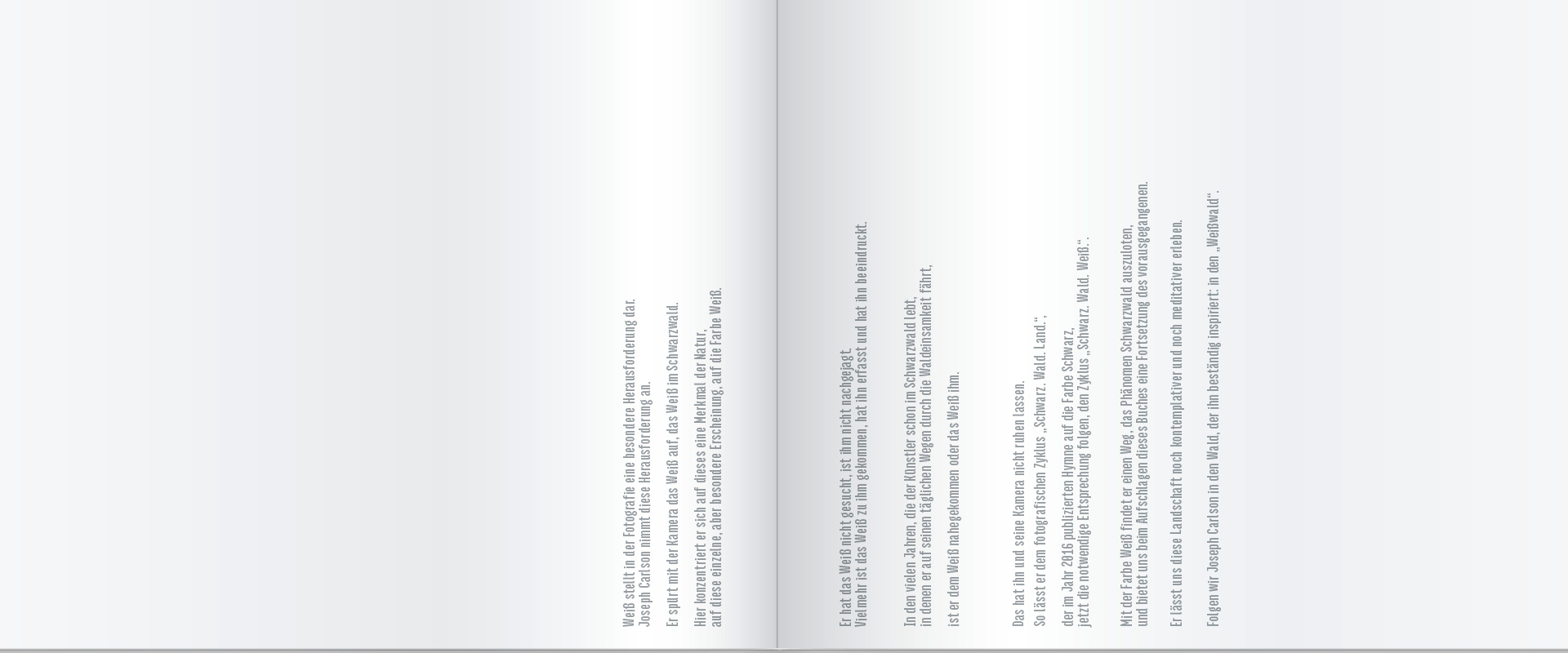 Joseph Carlson ist ein Künstler, der mit der Kamera malt. Mit der Farbe Weiß findet er einen Weg, das Phänomen Schwarzwald auszuloten und bietet uns beim Aufschlagen dieses Buches eine Fortsetzung des vorausgegangenen. Er lässt uns diese Landschaft noch kontemplativer und noch meditativer erleben.